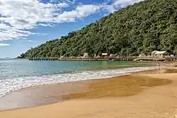The original meaning of the city's name is unknown. According to the city's archives, it is "River filled with Snook (Robalo)", which is a very common type of fish in this region.[4] Ilha das Cabras (Goats' Island) is directly opposite the city and is too small for habitation but it is lit at night. Visitors to nearby Laranjeiras Beach can sail there aboard 17th century-style pirate ships, going around Ilha das Cabras before returning to Balneário Camboriú.[5] The city also has a statue similar to Rio de Janeiro's Cristo Redentor (Christ the Redeemer). Standing atop the Morro da Cruz, Cristo Luz (Christ Light) portrays Jesus holding a circular "broad-brimmed hat" at his left shoulder, symbolizing the sun, and which houses a spotlight that shines out over the city. The Cristo Luz at 33 meters tall is only five meters shorter than the Redeemer and colorful lights both within and without the statue give it nighttime illumination.[6] Another common sight in the city are paragliders over the beach, alongside the tall buildings, from the gliderport in Praia dos Amores. To the west the city is bordered by the Camboriú River, which joins the ocean at the southern edge of the center of the city, where the cable car (teleférico) rises from the central beach.