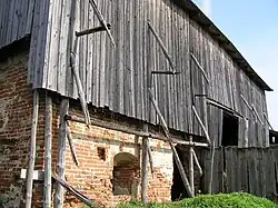 The congregation owned the deteriorating castle until the beginning of the 19th century when it was confiscated by the Tsarist authorities pursuant to the Russification policies and given to an Eastern Orthodox monastery.[6] In 1923, after the land reform, the property was divided and sold to farmers.[6] In the early 20th century, a farmhouse was built in the southwestern corner of the former castle.[7] During the Soviet era, the former castle belonged to a kolkhoz and suffered further damage as ramparts were plowed over, particularly on the southern side.[7] Around 1950, the second floor of the surviving eastern gate was demolished and bricks used for the construction of a dam on the Siesartis River.[5] In 1972, the castle was added to the registry of cultural monuments of Lithuania but due to a mistake it was described as a former fortified monastery.[1] Until the late 1990s and early 2000s, the castle attracted very little attention from archaeologists or historians.[1] The first archaeological excavation was carried out in 1987. The archaeologists removed debris and explored several sections in the territory, but no valuable artifacts were found and the excavation report was not submitted.[1] The same year, the ruins were covered by temporary wooden structures to protect them from further erosion. With financial assistance from Michal Giedroyc, more extensive excavations were carried out in 1999–2003 that explored an area of 399 square metres (4,290 sq ft).[4][5] In 2015, the former castle was declared a state protected monument.[8]