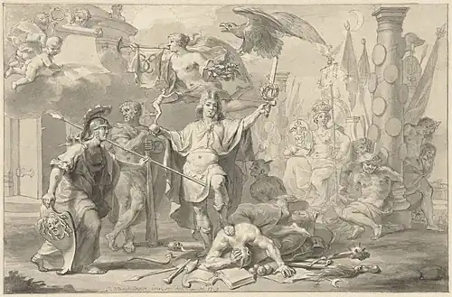 Boyar appeals were largely ignored by Charles, who added Prince of Cisalutanian Wallachia or Imperial Wallachia (Chesariceasca Valahie) to his list of titles, assigning Steinville to the intermediary position of Supreme Director of Oltenia.[20] The administration was directly organized by a Neo-Acquistic Commission, which answered to the Aulic and War Councils.[21] By August 1717, the Austrians had gained a definitive victory at Belgrade, prompting the Porte to sue for peace. The Treaty of Passarowitz, which was signed on 21 July 1718, recognized Oltenia as an Austrian fief, under uti possidetis.[22] Negotiations were stalled when the Porte instructed its delegates not to admit that Oltenia had been conquered ("under a kind of occupation" was the preferred formula); Austria reacted by bribing Ottoman officials, as well Dutchman Nicolas Theyls and other arbiters, until consensus could finally sway in their favor.[23]