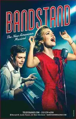 The musical, once again titled Bandstand, premiered on Broadway at the Bernard B. Jacobs Theatre on April 26, 2017, after starting previews on March 31, with Osnes and Cott and direction and choreography by Andy Blankenbuehler.[6] The Broadway cast featured Beth Leavel, Alex Bender, Joe Carroll, Brandon James Ellis, James Nathan Hopkins, and Geoff Packard.[7][8] The production closed on Broadway on September 17, 2017, after 24 previews and 166 regular performances.[9]