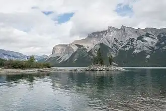 Archaeological evidence found at Vermilion Lakes indicates the first human activity in Banff to 10,300 BP.[9] Prior to European contact, the area that is now Banff National Park was home to many Indigenous Peoples, including the Stoney Nakoda, Ktunaxa, Tsuut'ina, Kainaiwa, Piikani, Siksika, and Plains Cree.[10][11] Indigenous Peoples utilized the area to hunt, fish, trade, travel, survey and practice culture.[10][11] Many areas within Banff National Park are still known by their Stoney Nakoda names such as Lake Minnewanka and the Waputik Range. Cave and Basin served as an important cultural and spiritual site for the Stoney Nakoda.[11]