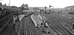 Bank Hall opened in 1850 as an intermediate station when the Liverpool, Crosby and Southport Railway was extended from its previous terminal at Waterloo to Liverpool Exchange. It became part of the Lancashire and Yorkshire Railway (LYR), on 14 June 1855.[1] The Lancashire and Yorkshire Railway amalgamated with the London and North Western Railway on 1 January 1922 and in turn was Grouped into the London, Midland and Scottish Railway in 1923. Nationalisation followed in 1948 and in 1978 the station became part of the Merseyrail network's Northern Line (operated by British Rail until privatisation in 1995). Only one of the two island platforms located here is still in use - the other remains but has no track and is heavily overgrown.[2]