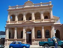 Charters Towers was at its economic peak in the late 19th century. According to Government Geologist Robert Logan Jack, Charters Towers was the third largest gold producing area in Australia, after Ballarat and Sandhurst (Bendigo).[28] Many new buildings were completed in this period in Charters Towers. The "T" junction of Mosman and Gill Streets became the financial district of Charters Towers. For one block to the east, north, and south were eight banks, the post and telegraph office, two assaying offices, and four solicitor's offices. Share-brokers occupied the Royal Arcade, and other offices were located in Mosman and Bow Streets. The Royal Arcade was built in 1888 for Alexander Malcolm and by 1890 the Stock Exchange operated from the building. Other significant buildings of this era include the 1887–92 Masonic Lodge and the 1892 Post Office (Commonwealth Heritage List 105523). Banks of this era include the 1881 (lowset timber) Bank of Australasia, the London Chartered Bank (which purchased the two-storey masonry building from local builder Hugh Ross in 1887), the former Australian Joint Stock Bank (later the Australian Bank of Commerce) and the Queensland National (QN) Bank, both designed by FDG Stanley and both built in 1891. The Union Bank then occupied the former QN Bank premises in Mosman Street.[29] All of these buildings remain, apart from the Bank of Australasia. The Bank of NSW was considered the first financial institution to erect premises worthy of the town and the business conducted there. The North Queensland Register claimed it was the largest banking institution in Australasia in the 1890s.[1][30]