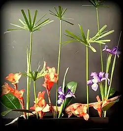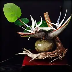 Banmi Shōfū-ryū (晩美生風流) is a school of Ikebana, an ancient Japanese art form that involves arranging flowers for spiritual purposes.[1] Ikebana accompanied Buddhism's arrival in Japan in the 6th century and evolved from a Buddhist ritual. This ritual, which started in India, consisted of throwing “floral offerings” to the spirits of those who had passed.[1] By the 10th century, containers were used for the floral offerings, slowly representing the development of Ikebana. Kado, which means “way of the flower,” is used in Ikebana practice and began to spread into more of an aesthetic than a spiritual representation during this time.[2] By the 15th century, Ikebana embodied what it is known for today, an art form with a spiritual foundation.[1] Ikebana is a way to connect with the flowers through active meditation, producing calmness and concentration for those who engage in this complex and expressional art.[1] Ikebana has also been shown to have calming physiological effects on both creators and viewers of the art.[3][4]