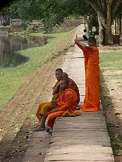 Srah Srang or "The royal bathing pool" or "pool of ablutions" to the east of Banteay Kdei, which was dug to dimensions of 700 metres (2,300 ft)x300 metres (980 ft) during the reign of Rajendraverman in the 10th century, was beautified by Jayavarman VII with well laid out steps of laterite stones with external margin of sandstone, on the banks of the pond facing the Sun. It is set amidst large trees and has turquoise blue waters all the year round. The approaching steps to the water edge are flanked by two stone statues of lions with ornamented Nāga-balustrades.[1][7] The pond was reserved for use by the king and his wives. A stone base seen at an island in the centre of the pond once housed a wooden temple where the king did meditation. At the lily filled lake, watching sunset reflections in the lake is quite an experience. The water from the lake is now used for rice cultivation by farmers of the area.[10][15]