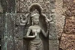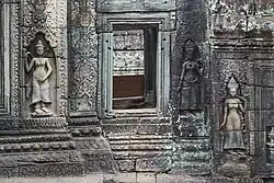 The third enclosure has a gopura which has a cruciform plan. It has pillars which are crossed by vaults. There are three passages in this enclosure, two on either side are independent, with laterite walls. The niches here have small figurines, and large apsara devatas in single poses or in pairs of dancing poses. Large Buddha images, in an internal courtyard of this enclosure, have been defaced by vandals. A paved access from here leads to the main shrine, which comprises two galleried enclosures. At the entrance to these enclosures, from the eastern end, is the "Hall of Dancers", which has four open courtyards and the pillars have fine carvings of apsaras.[12]