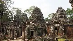 Banteay Kdei (Khmer: ប្រាសាទបន្ទាយក្តី; Prasat Banteay Kdei, lit.'A Citadel of Chambers'),[1] also known as "Citadel of Monks' cells",[2] is a Buddhist temple in Angkor, Cambodia. It is located southeast of Ta Prohm and east of Angkor Thom. Built in the mid-12th to early 13th centuries AD during the reign of Jayavarman VII (who was posthumously given the title "Maha paramasangata pada"[3]), it is in the Bayon architectural style, similar in plan to Ta Prohm and Preah Khan, but less complex and smaller. Its structures are contained within two successive enclosure walls, and consist of two concentric galleries from which emerge towers, preceded to the east by a cloister.[4][5]