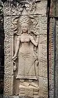 The Khmer Empire lasted from 802 to 1431, initially under Hindu religious beliefs up to the end of the 12th century and later under Buddhist religious practices. It was a time when temples of grandeur came to be built and reached a crescendo during the reign of Suryavarman II until 1145/1150, and later in the 12th–13th centuries, under Jayavarman VII. Many Buddhist temples were built, including the Banteay Kdei, from middle of the 12th century to early 13th century. Though Jayavarman VII was credited with building many temples, he was also accused of squandering money on extravagant temple building projects at the expense of society and other duties. He built Buddhist temples in which Bodhisattva Avalokitesvara was the main deity.[5] This temple built, conforming to the style of the Ta Prohm and Preah Khan temples in the vicinity during the same period by Jayavarman VII, but of a smaller size, was built as a Buddhist monastic complex on the site of a 10th-century temple built by Rajendravarman. Some small inscriptions attest to the building of this temple by Jayavarman VII and the royal architect, Kavindrarimathana.[4]