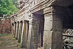Some specific architectural features which evolved with the Bayon style are clearly discerned in this temple. The roof is supported on free-standing pillars in the eastern and western pavilions in the third enclosure, built in a cruciform plan with the inner row of pillars supporting the roof. The pillars are also tied to the wall by a tie beam using a "mortise–and–tenon join" patterned on wooden structures. Other features noted are of the four central pillars in the western pavilion which have been strengthened with temporary supports of laterite stone block pillars. Carvings of Buddha are seen on all these pillars but mostly defaced. The temporary support system provided to the roof built on free standing pillars is indicative of problems of design seen in the temples built during this period.[16]