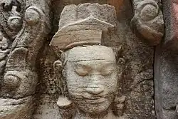 The external enclosure with four concentric walls, has four gopuras similar to the Ta Prohm temple, and all are in some degree of preserved status. At the four corners, the gopuras have a fascia of Lokesvara (Buddhist deity, Avalokitesvara) mounted over Garuda images (it is also mentioned that the smiling faces are of King Jayavarman II, similar to those seen in the Beyan temple[15]). The east facing gopura, in particular, has well-preserved garuda images on its corners. Two hundred meters from the west entrance of this enclosure leads to a moat, which is decorated with statues of lions and naga-balustrades mounted on garudas. The moat itself has in its precincts the third enclosure which measures 320 m × 300 m (1,050 ft × 980 ft), also enclosed with laterite walls.[12][14] The Buddha image at the entrance to the moat, near the second interior gate, is well preserved, considering the fact that most of the other statues have been destroyed or stolen.[10]