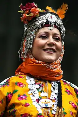 Barak Turkmen women traditionally wear üç etek with a belt. An orange headscarf known as "Ahmediye" worn by women as a part of their traditional folk costume is an iconic piece that has become a symbol of the Baraks. This often features roses and feathers known as "tozak." On some occasions, a fez with coins is worn over Ahmediye. Men wear aba with regional patterns and shalwar with a keffiyeh wrapped around the waist. A white keffiyeh may be worn on the head.[26][27][28]