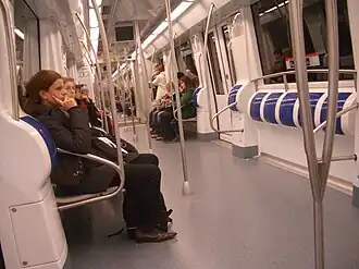 The trains have closed-circuit television and passenger alarms for public safety,[5] visual and audible door indicators, LCD screens for travel information and advertising, and line maps with lights that indicate the next stations. SEC Lighting provided the semi-recessed fluorescent saloon lighting for the trains.[13]