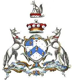 Canting arms of Fox, Baron Holland: Ermine, on a chevron azure three fox's heads and necks erased or on a canton of the second a fleur-de-lys of the third