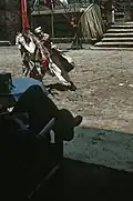 The Reog dance of Ponorogo in Java involves a lion figure known as the singa barong.[4][5] It is held on special occasions such as the Lebaran (Eid al-Fitr), City or Regency anniversary, or Independence day carnival. A single dancer, or warok, carries the heavy lion mask about 30 – 40 kg weight by his teeth. He is credited with exceptional strength. The warok may also carry an adolescent boy or girl on its head. When holding an adolescent boy or girl on his head, the Reog dancer holds the weight up to total 100 kilograms. The great mask that spans over 2.5 meters with genuine tiger or leopard skin and real peacock feathers. It has gained international recognition as the world's largest mask.