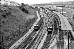 In its heyday (prior to the early 1960s), the station had four operational platforms - one long main platform on the 'up' side divided into 2 sections (numbered 1 & 2, with 2 served by a dead end spur off the through line to Barry Pier) and an island platform on the 'down' side (numbered 3 & 4). There were also several carriage sidings at the east end of the station opposite platform 2, with a signal box at each end of the station[1] to control the layout. The 'East' ’box was closed in 1964 and replaced by two groundframes, "A" and "B", "A" being housed in a ground-level cabin, and bearing single-line token apparatus for any workings over the single tunnel line to Barry Pier but with the former 'West' ’box taking over responsibility for the passenger service to & from the station.[2] The branch from Barry was built as double track, but was singled in 1969. The line between Barry Island station and Barry Pier through the tunnel had been singled to the tunnel's half-way point in 1929 at which point it doubled and then quadrupled into the station platform area at the Pier terminus.