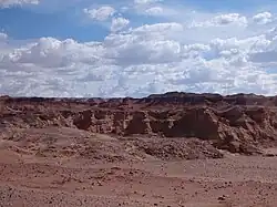 It was previously known as the Lower Nemegt Beds occurring beneath the Nemegt Formation and above the Djadokhta Formation. It has been suggested that the Djadokhta and Baruungoyot Formations are lower and upper parts, respectively, of the same lithological unit and the boundary between the two does not exist. The stratotype of the Baruungoyot Formation is the Khulsan locality, east of Nemegt. At Nemegt, only the uppermost barungoyotian beds are visible. The Red Beds of Khermeen Tsav are also considered part of the Baruungoyot Formation. It is approximately 110 metres (360 ft) in thickness,[2] and was laid down roughly 72-71 million years ago. Given the new date for the start of the Maastrichtian (72.1 MYA) a basal Maastrichtian age seems probable. The Baruungoyot Formation preserves an environment of sand dunes, created from wind-eroded rocks (aeolian dunes).