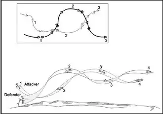 Passing the defender is referred to as a "wingline overshoot". Also called a "3-9 line overshoot" or a "dangerous overshoot", this occurs when an attacking aircraft approaches too fast and accidentally crosses the defender's wingline (an imaginary line passing through the center of the aircraft at the 3 o-clock and 9 o-clock positions). A wingline overshoot is usually referred to as "flying out in front" and causes "role reversal", putting the attacker in range of the defender's weapons, and the attacker suddenly becomes the defender.[44]