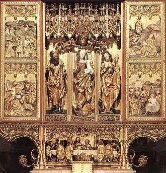 Many of the paintings of the Passion on the altar's polyptych are based on the engravings by Lucas Cranach of the Passion cycle, published in 1509. The statues of the Twelve Apostles on the altar's ciborium date from about 1390, and may have been part of an earlier altar in the church.[9]