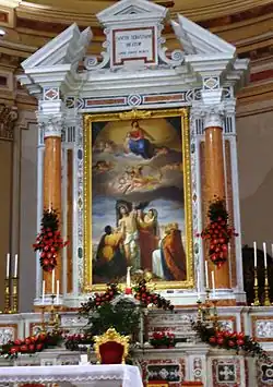 The main altar is made of polychrome marble, in the form of the elevation of a Roman temple with a symmetrical double interrupted pediment with central memorial stele. The whole recalls the style of the façade. Between the columns with their Corinthian capitals is a canvas depicting the Martyrdom of Saint Sebastian where Irene of Rome in mourning retrieves the body of the saint, and a maid and Saint Nicholas of Bari (former protector of the village of Barsalona) are kneeling, the work of Giacomo Conti in 1879. Completing the scene the Madonna in Glory, with Our Lady of Graces, the co-patron saint of Barcellona Pozzo di Gotto, is pictured between hosts of angels, cherubim and seraphim, thrones and dominations. The marblework was undertaken by Salvatore Manganaro, directed by Maria Mento and Angela Mento, and completed in 1960.