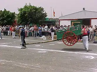 The "oxcart game" is a display of strength. Contestants have to lift the back of an ox cart, usually weighing around 360 kg (790 lb), and the end usually at around 40 cm (16 in) above the ground. The cart is pivoted to the ground at the front end and competitors must rotate it, trying to go around as many times as possible in a sideways motion.
