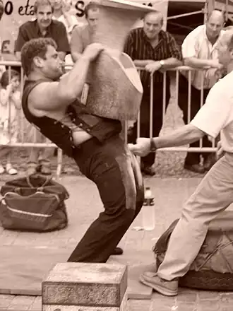 Literally "axe test", this rural sport more commonly known as aizkolaritza, from the Basque word for a wood-cutter. This is a very popular sport today but its origins are to be found in the rural wood cutting and charcoal burning communities of earlier periods.