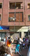 Greasing the Cockaigne pole for the Tomatina in Buñol, Valencia.