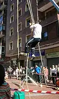 The most difficult part is to get the bale to the required height for the first time. Once that has been achieved, the competitors allow the bale to drop in free fall, grabbing the rope and jumping up at the appropriate moment to use their own body weight to lift the bale again when coming down. A lot of skill is needed to avoid rope burn. The visual appearance is not dissimilar to swinging on a church bell rope.