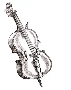 Bass violin is the modern term for various 16th- and 17th-century bass instruments of the violin (i.e. viola da braccio) family. They were the direct ancestor of the modern cello.[1] Bass violins were usually somewhat larger than the modern cello, but tuned to the same nominal pitches or sometimes one step lower. Contemporaneous names for these instruments include "basso de viola da braccio," "basso da braccio," or the generic term "violone," which simply meant "large fiddle." The instrument differed from the violone of the viol, or "viola da gamba" family in that like the other violins it had at first three, and later usually four strings, as opposed to five, six, or seven strings, it was tuned in fifths, and it had no frets. With its F-holes and stylized C-bouts it also more closely resembled the viola da braccio.