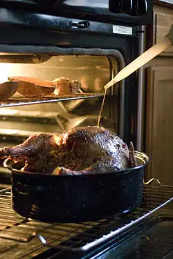 Basting is a cooking technique that involves cooking meat with either its own juices or some type of preparation such as a sauce or marinade, such as barbecue. The meat is left to cook, then periodically coated with the juice.[1]