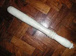 A straight, fixed-length baton (also commonly referred to as a "straightstick") is the oldest and simplest police baton design, known as far back as ancient Egypt.[5] It consists of little more than a long cylinder with a molded, turned or wrapped grip, usually with a slightly thicker or tapering shaft and rounded tip. They are often made of hardwood, but in modern times are available in other materials such as aluminium, acrylic, and dense plastics and rubber. They range in size from short clubs less than 30 cm (1 ft) in length to 90-centimetre-long (3 ft) "riot batons" commonly used in civil disturbances or by officers mounted on horseback.