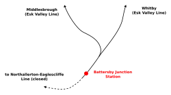 Battersby is unusual on the British railway network, due to the layout of the tracks. Formerly the place where the branch from Middlesbrough joined the through route from Whitby to Picton (on the Stockton to Northallerton portion of the former Leeds Northern Railway), the closure of the direct line west of Battersby in 1954 means that all services have to reverse in the station. Until the rationalisation of the signalling in 1989 it was common for two trains to do so at the same time, in order to pass each other on the single track Esk Valley line. Trains can still pass each other in the one remaining platform, using the "first in, last out" principle, as the platform line is signalled to permit two trains to occupy it at once.
