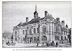 The building, designed in 1891 by E. W. Mountford,[1] opened in 1893 as Battersea Town Hall, the administrative headquarters of the Borough of Battersea, shortly after the borough was transferred from the county of Surrey to the newly formed County of London. It is built from Suffolk red brick and Bath stone,[1] on the site of Jane Senior's Elm House, a villa with a small wooded estate.[2][3]