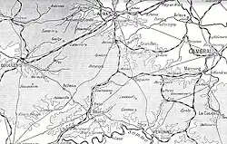 Orders came from Paris to abandon Lille, which was evacuated on 24 August and the 82nd Territorial Division formed a line from La Bassée to Corbehem, with the 81st Territorial Division forming a line from Aire to the sea. The Sixth Group of Reserve Divisions (also known as Groupe Ebener, with the 61st and 62nd Reserve divisions) were sent from Paris, increasing d'Amade's force to six divisions, to hold a 70 mi (110 km) line from Douai to Béthune and Aire, to the sea, with another 25,000 troops of the Lille garrison.[2] On 25 August, the German II Corps advanced westwards through Denain, to get behind the left flank of the BEF and after dark reached the vicinity of Cambrai, where rearguards of the 84th Territorial Division defended the Sensée Canal at Bouchain, against a German attempt to cross. During 26 August, the division slowly retreated west of Cambrai; Groupe Ebener arrived at Marquion and were then ordered by Joffre to Combles and Péronne, to become part of the Sixth Army. The divisions retreated westwards, covered by the 84th Territorial Division, in actions which diverted part of the German II Corps from the BEF during the Battle of Le Cateau (26 August).[3]