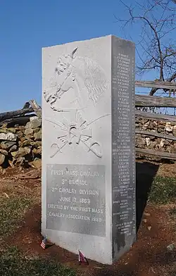 About 2 pm, Gregg's advance column of the 2nd and 4th New York, 6th Ohio, 1st Maine, 1st Rhode Island, and 1st Massachusetts, under the command of Brig. Gen. Judson Kilpatrick arrived in Aldie.[2] Just west of the village the 1st Massachusetts encountered Munford's pickets and drove them back. Around the same time, the rest of Munford's brigade (the 1st, 4th, and 5th Virginia Cavalry, under the command of Col. Williams Carter Wickham) arrived at Dover Mills, a small hamlet on the Little River west of Aldie. Wickham ordered Col. Thomas L. Rosser to take the 5th Virginia to locate a campsite closer to Aldie. As they moved east they ran into the Massachusetts men and easily drove them back through Aldie to the main Union body. After positioning his sharpshooters (50 men of Company I under Capt. Reuben F. Boston) east of the William Adam farmhouse, Rosser deployed west along a ridge that covered the two roads leading out of Aldie and awaited the arrival of the Federals, as well as Munford and Wickham. As Rosser withdrew west, the 1st Massachusetts, with aid from the 4th New York, charged against what they believed to be a retreat. Rosser's line held and he mounted a countercharge in concert with a sharp volley from the sharpshooters he had placed on his left and easily drove the Federals back, securing his hold on the Ashby's Gap Turnpike.