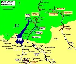 Bonaparte posted General of Division Claude Vaubois with 10,000 men on the west side of Lake Garda. General of Division André Masséna defended the Adige River valley with 13,000 troops and General of Division Pierre Augereau covered Verona with 10,000 more. General of Division Charles Kilmaine maintained the blockade of Mantua with General of Division Jean Sahuguet's division of 8,000 soldiers and held a 2,000 man reserve at Verona.[4] Another source gave Vaubois 11,000, Massena 13,000, Augereau 9,000, Sahuguet 10,000, and Kilmaine 3,500 soldiers.[5]
