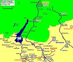 Wurmser unexpectedly headed west toward Mantua and joined the division of Mészáros at Vicenza. Immediately, Bonaparte sent his two divisions after the Austrians, hoping to cut them off. Masséna advanced southwest from Vicenza while Augereau moved south to Padua to close the Austrian escape route to the east. General-Major Peter Ott distinguished himself by leading Wurmser's vanguard in the race for Mantua. A French battalion holding Legnago abandoned its post, allowing the Austrians passage across the Adige.[4] Wurmser left 1,600 men to hold the city and continued his march. On 11 September, Masséna intercepted the Austrians at Cerea with two brigades weakened by straggling.[15] Ott held on until Wurmser arrived with the main body,[16] driving the French back with 1,200 casualties.[17] Bonaparte ordered Sahuguet to take up blocking positions at Castel d'Ario and at Governolo where the Mincio River flowed into the Po River. The next day, the Austrian field marshal, assisted by a local guide, crossed a bridge that Sahuguet failed to destroy and led 10,000 infantry and 3,000 cavalry to Mantua.[18]