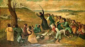 Guyon led the column attacking from the front, and, as he did not speak Hungarian well, he addressed the following speech to them, interspersing Hungarian and German words: Vorwärts dupla lénung, rückwärts kartács schiessen.[10] Which in English means something like: “If you go forward, you get double pay, if you retreat, I'll receive you with grapeshots”'.[10] However the attack led by the 33rd Honvéd Battalion was soon repulsed, because the Hungarian cannons, positioned near Korotnok, could not be effectively support the infantry, being on a much lower ground than the attacking soldiers.[8] When the Honvéds retreated, they found themselves confronted by Guyon's cannons, who fulfilled his vow and fired into them,[10] leaving one officer and 10 soldiers dead or wounded.[12] Guyon's center was then contented with a stationary artillery duel until the columns sent against the enemy's right and left and partly in its rear, appeared on the mountaintops surrounding the pass.[8] Then, at about 3 p.m., the 33rd Honvéd Battalion renewed its attack, but this did not go smoothly either.[8]