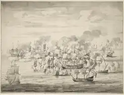 Hollar, who reportedly sat on deck sketching during the action,[2] later produced an etching of the battle, which was included in Ogilby's 1670 Africa. The picture shows the Algerine line engaging the Mary Rose and the Roe, while Rose Leaf chases King David to the southeast, the French merchantman escapes to the northwest, and the other merchantmen shelter behind the Mary Rose.[2] Willem van de Velde the Younger soon after made his own drawing of the battle, based on Hollar's.[14] A van de Velde oil painting based on Hollar's etching of the Mary Rose engagement is in the Royal Collection, where it has been held at least since 1687, and is currently (2013) on public display in the Queen's Private Dining Room at Hampton Court Royal Palace.[9][15] A copy with the monogram of Adriaen van Diest inscribed on the reverse was with the Leger Galleries in London in 1973, and another is recorded as being in the collection at Castle Howard, North Yorkshire, England. This picture was possibly commissioned during Kempthorne's lifetime or by his family: alterations from the original were made to the flags in order to correct them.[15] A painting signed by Peter Monamy in the National Maritime Museum has an inscription stating that it depicts this battle. It is more likely, however, that it was intended to depict a similar battle fought in 1681 by Morgan Kempthorne, John Kempthorne's son, in the Kingfisher.