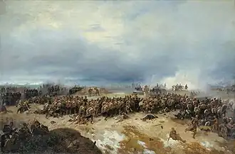 On 6 January 1854 (Christmas Day in the Russian Orthodox calendar), Ahmed renewed his assault with a force of 18,000 men.[3] The Russians repelled several attacks but were running out of shells and losing a significant number of the troops.[3] However, Russian reinforcements arrived during the day (under Major General Karl Aleksandrovich Bellegarde[3]) and pushed the Turks out of their trenches, but failed in their attempts to dislodge the Turks from the staging area.[2]