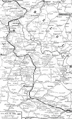 Roulers fell the next day and by 16 October, the British held the north bank of the Lys up to Harelbeke and had crossed the river at several points.[6] By 17 October, Thourout, Ostend, Lille and Douai had been recaptured; Bruges and Zeebrugge fell by 19 October and the Dutch border was reached the following day.[7] The crossing of the Lys and the capture of Courtrai by the British Second Army on 19 October, led to a German retreat on the front of the Fifth Army further south, which encircled Lille on 18 October.[8] Next day the British were in Roubaix and Tourcoing and by the evening of 22 October, the British had reached the Scheldt from Valenciennes to Avelghem.[9]