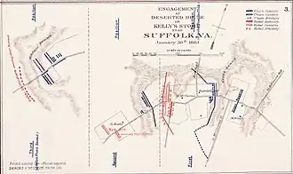 Confederate forces under Brig. Gen. Roger A. Pryor crossed the Blackwater River into southeast Virginia on a foraging expedition.[1] Maj. Gen. John J. Peck commanded the Union garrison at Suffolk. Peck organized a force to drive Pryor out of the area and assigned Brig. Gen. Michael Corcoran to its command.[1] Anticipating an attack from the Union garrison, Pryor prepared his forces for battle near Kelly’s Store, located 8 miles west of Suffolk.[1]