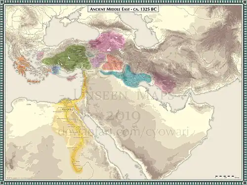 Map of the Middle East in 1325 BC showing the location of Hittite Empire and the suggested location of the Hayasa Azzi confederation
