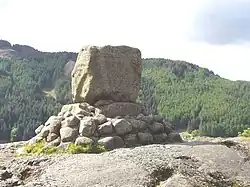 Bruce's Stone is a large granite boulder commemorating King Robert's victory in 1307. It is atop the hill on the north side of Loch Trool. In 1929, on the 600th anniversary of Bruce's death, it was placed high above the northern shore of Loch Trool, from where, legend has it, he had commanded the ambush that took place on the Steps of Trool on the other side of the loch. It also serves as a starting spot for the challenging walk up Merrick (2764 feet), the highest mountain in southern Scotland.[7]