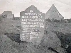 The 2nd Canadian Mounted Rifles, who had been guarding the baggage train, spurred forward towards the fight and made a series of determined charges on the Boer positions to relieve pressure on the main force. Twenty-one Canadians from 3 and 4 Troops, 'E' Squadron, under the command of Lt Bruce Carruthers became cut off from the main force during a charge, but rather than surrender they determined to fight to the last, eventually running out of ammunition and being overrun. Around 5 pm, the Boers called off the attack and withdrew, having inflicted great damage on the British force and escaping with minor losses.[4]