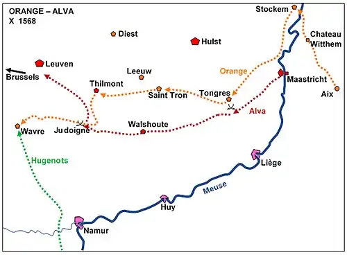 When Orange met Genlis, he found the Huguenot army was disappointingly small, numbering about 2,000 infantry and 500 cavalry (estimates of the total vary between 2,000 and a probably exaggerated 5,800).[21] That was not even enough to provide a decisive advantage over Alva. Seeking a way back to Germany before the winter, Orange would be refused passage through the Prince-Bishopric of Liège. Orange and Alva would fight again at the Battle of Le Quesnoy. Orange's army would pass through France to Strasbourg, where Orange paid off most of his army. Alva took revenge on the towns that supported Orange. For example, the burgomeisters of Leeuw were sentenced to death for yielding to Louis, even though they had sent their garrison as ordered to reinforce Thilmont. His generals managed to persuade Alva that was unjust, so he commuted the sentence to executing just one of them.[22] To the north of the campaign, the town of Diest, owned by William of Orange, had sent provisions to support Orange's army. As punishment, the town had to fund a tercio of the Army of Flanders and some years later, in 1572, the Spanish King Philip II confiscated Diest, destroying its fortifications.[23]