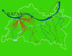 The Battle of Kazan (1774) was a major battle during Pugachev's Rebellion. It took place on 12–15 July 1774 in Kazan, Russia, and the surrounding area. The first stage began in the morning of 12 July, when rebels under Yemelyan Pugachev defeated government troops and besieged them in the Kazan Kremlin. During the battle some government forces defected to the rebels' side. However, in the evening, tsarist forces under Johann Michelson reached Kazan and defeated the rebels in two battles which took place on 13 and 15 July, forcing Pugachev to retreat to Tsaryovokokshaysk and then to cross the Volga. Out of 25,000 and 15,000 rebels who participated in the first and last stages of the battle respectively, only 500 escaped.[1]
