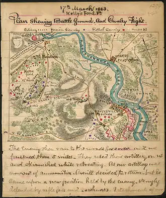 The Battle of Kelly's Ford, also known as the Battle of Kellysville or Kelleysville,[3] took place on March 17, 1863, in Culpeper County, Virginia, as part of the cavalry operations along the Rappahannock River during the American Civil War. It set the stage for Brandy Station and other cavalry actions of the Gettysburg Campaign that summer. Twenty-one hundred troopers of Brig. Gen. William W. Averell's Union cavalry division crossed the Rappahannock to attack the Confederate cavalry that had been harassing them that winter. Brig. Gen. Fitzhugh Lee counterattacked with a brigade of about 800 men. After achieving a localized success, Union forces withdrew under pressure in late afternoon, without destroying Lee's cavalry.
