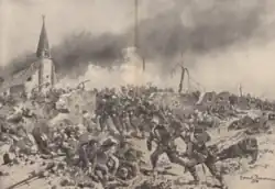 Until May 1915 French reached some partial successes securing positions south of the hill. On spring 1915 French and British command prepared a huge offensive with one of the mayor tasks to take the Lorette Spur with the Lorette Hill as a keypoint. During the intense fighting from 9 to 12 May 1915 soldiers the 70th, part of the 77th and the 13th divisions, including Moroccan units,[6] were able to cross heavily fortified terrain and take the trenches on the higher ground around the chapel,[7] already almost destroyed by the French artillery barrage. Direct attack against German positions and hand-to-hand combat led to heavy losses. For the next ten days smaller skirmishes occurred as the French were securing their positions on the top of the hill,[8] while German lines still stayed just a few hundred meters on the east side of the hill keeping the French positions under artillery bombardment.