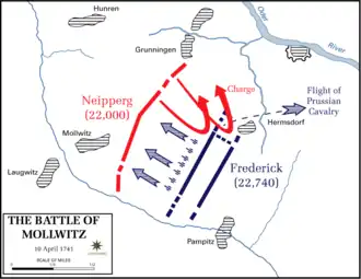 Captured Austrian soldiers told Frederick the exact position of Neipperg's forces at Mollwitz, and the morning fog and snow allowed Frederick's army to advance undetected to within 2000 paces of Neipperg's camp.[15] Most commanders would then have given the order to charge the camp and rout the Austrian army, but since Frederick had never fought a campaign or a battle before, he instead decided to deploy his army in a battle line.[16] There was very heavy snow on the ground which caused snow-blindness, and Frederick miscalculated the distance to the river on his right. He deployed several of his units behind a bend in the river where they could take no part in the battle, and several more units were deployed perpendicular to his two battle lines on the right flank. It is said that Schwerin commented early on that Frederick miscalculated the distance, but he was ignored.[17]