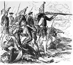 After the repulse of the Austrian cavalry, Schwerin reformed the infantry and ordered infantry units that were short on ammunition to strip the dead of theirs.[37] He then ordered the right flank of the Prussian infantry to advance toward the Austrian infantry line,[40] with the left flank receiving the order to advance a few minutes later.[41] This resulted in an oblique order attack on the Austrian infantry line with the right flank of the Prussians overlapping the left flank of the Austrians.[42] In addition, the Prussian infantry's use of the recently invented iron ramrod,[43] allowed them to fire 4–5 shots a minute with their flintlock muskets, which was three times more rapid than any other European army at the time.[44] This combination of discipline and firepower quickly overwhelmed the Austrian infantry, which consisted of a large number of raw recruits[45] lacking the training of the Prussian infantry.[46] Soon, the Austrian line collapsed from left to right,[42] and the Austrian army was routed from the field.[30]